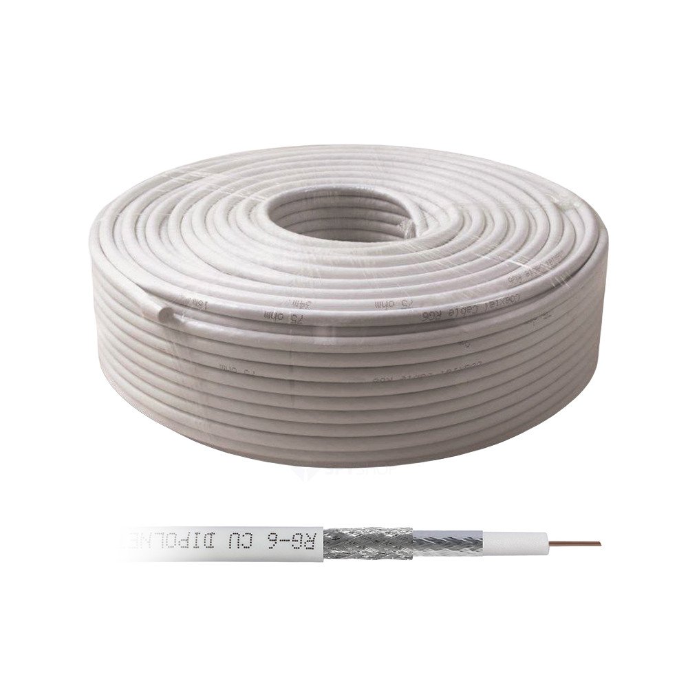 Cablu RG6 Cu/Cu 75 ohm de înaltă performanță, 100 m – conductor central din cupru, izolație foam PE, dublu ecranaj foil Al/PET și mesh cupru, cu mantie PVC alb 6,8 mm. Conceput pentru transmisie TV, satelit, CCTV și distribuție semnal digital profesional.
