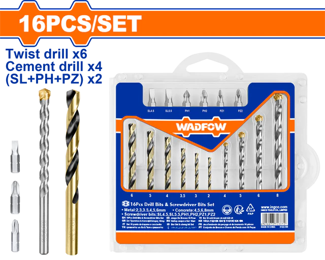 Set burghie și biți pentru metal și beton Wadfow, 16 buc este un kit esențial, ideal pentru găurire și fixare. Acest set versatil include burghie HSS pentru metal și burghie TCT pentru beton/zidărie, alături de biți de șurubelniță. Toate cele 16 piese vin organizate într-o cutie, fiind perfect pentru orice proiect de reparații sau construcții.