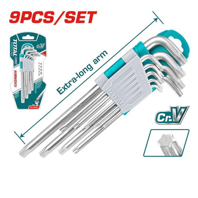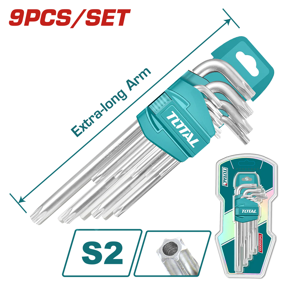 Set 9 chei imbus Torx TOTAL Industrial – dimensiuni T10-T50, profil L, oțel aliat rezistent și suport inclus.