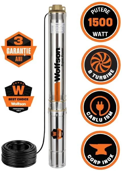 Pentru a asigura un acces constant și fiabil la apă curată din puțuri, fântâni sau foraje de adâncime medie, ai nevoie de o pompă submersibilă care să combine eficiența cu durabilitatea. **Pompa Submersibilă Wolfson pentru Apă Curată cu 8 Turbine** este concepută exact pentru aceste cerințe, oferind un echilibru optim între presiune, debit și fiabilitate. Parte din gama de utilaje și pompe de încredere Wolfson, acest model este un instrument esențial pentru orice proprietar din România care dorește să beneficieze de o sursă de apă sigură și constantă.